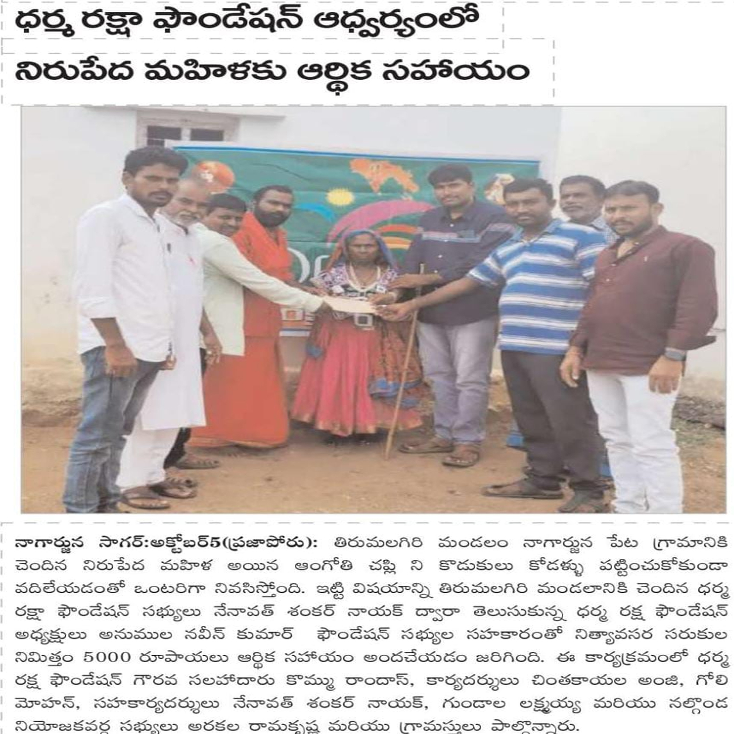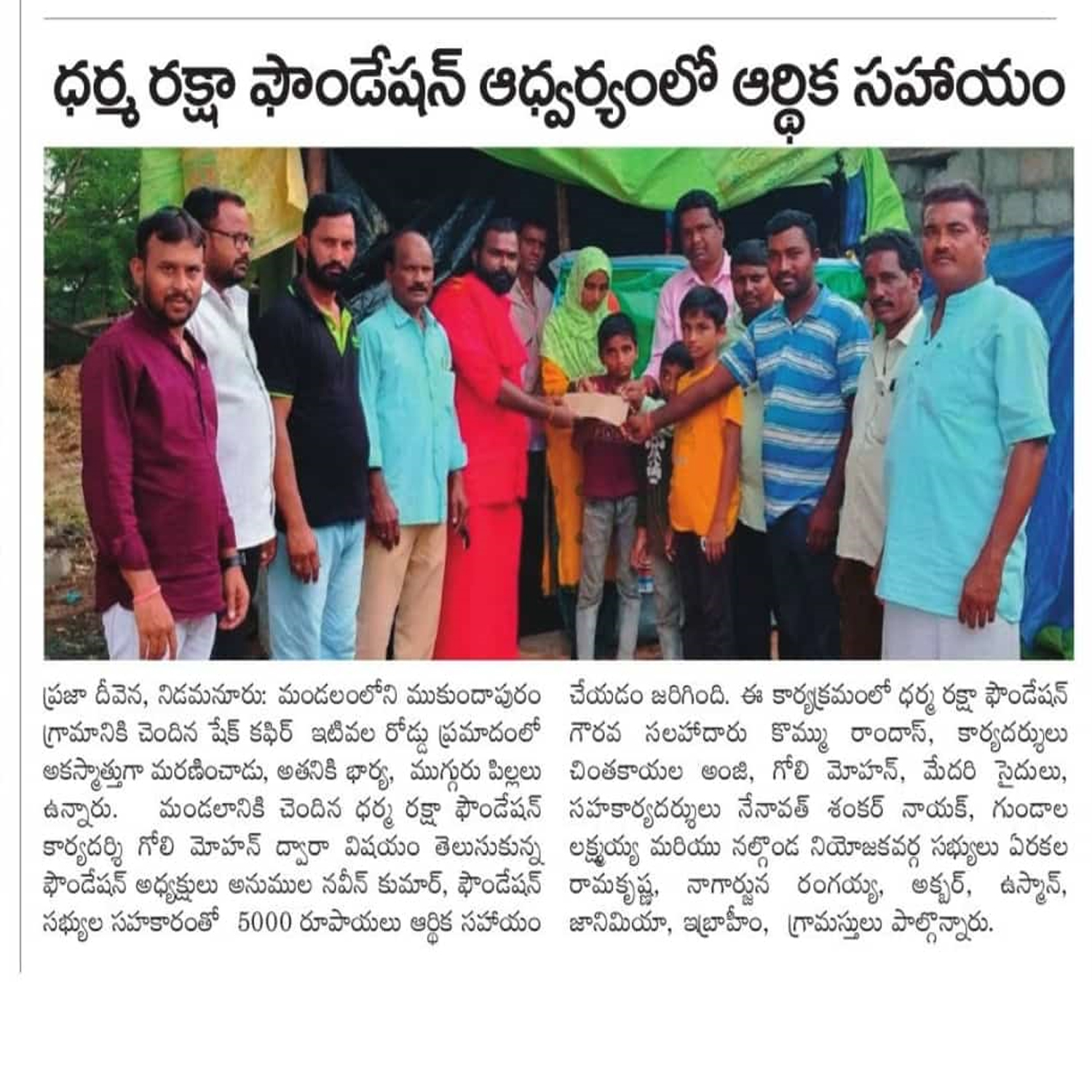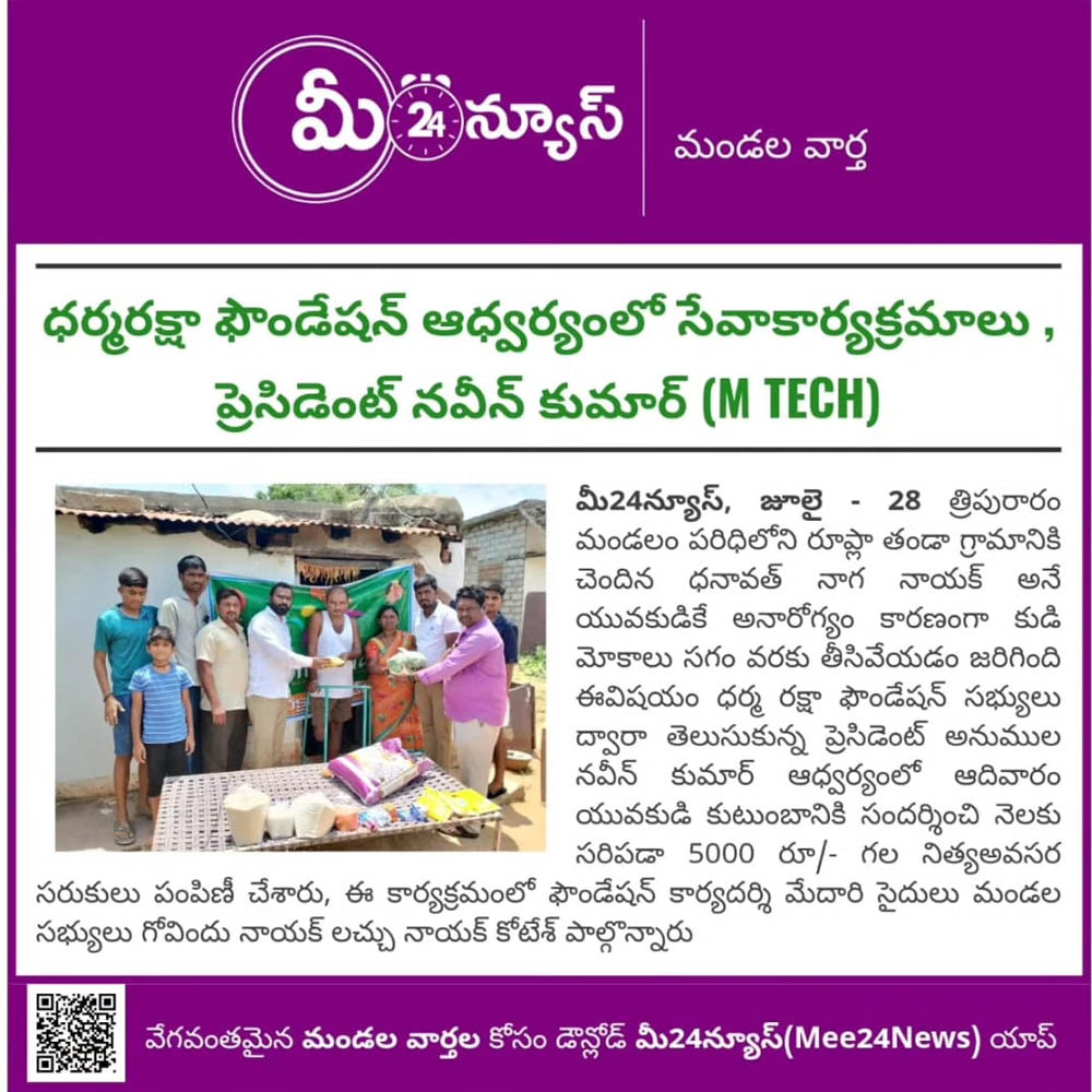 Dharma Raksha Foundation President, Anumula Naveen Kumar, emphasized that the foundation will always stand by the underprivileged. Recently, in Koppol village of Gurrampodu Mandal, the foundation provided financial assistance to the family of the late Gattupelli Yadagiri Reddy for family expenses after his passing due to illness. Additionally, they supported the family of Paloju Anjayya Chari, who is suffering from paralysis, with ₹5,000 for medical expenses. The event was attended by the foundation's Honorary Advisor Kommu Ramadasu, Secretary Nenavath Shankar Naik, Treasurer Ayitharaju Nagaraju, Tripuraram Mandal President Dhanavath Govind Naik, General Secretary Dhanavath Lachu Naik, along with local youth members Telukuntla Ravi, Venkatachari, Ramakrishna, Naresh, Shankar Goud, Ramakrishna, and Naveen.