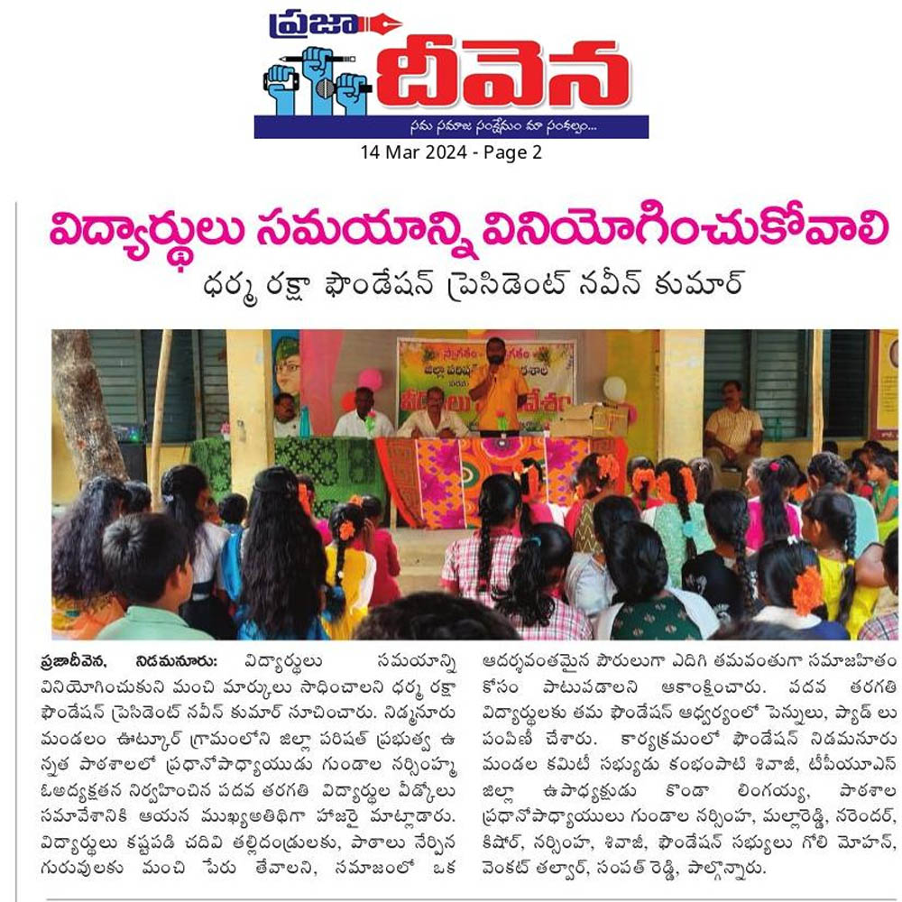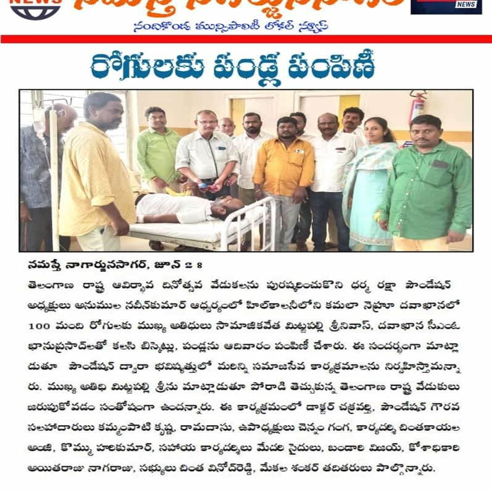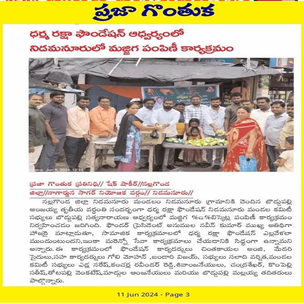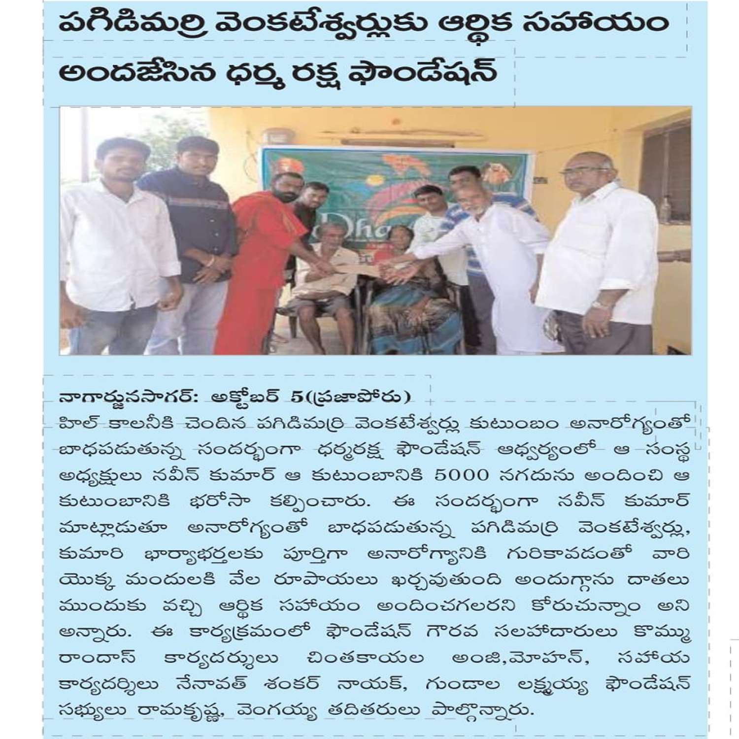 Dharma Raksha Foundation President, Anumula Naveen Kumar, emphasized that the foundation will always stand by the underprivileged. Recently, in Koppol village of Gurrampodu Mandal, the foundation provided financial assistance to the family of the late Gattupelli Yadagiri Reddy for family expenses after his passing due to illness. Additionally, they supported the family of Paloju Anjayya Chari, who is suffering from paralysis, with ₹5,000 for medical expenses. The event was attended by the foundation's Honorary Advisor Kommu Ramadasu, Secretary Nenavath Shankar Naik, Treasurer Ayitharaju Nagaraju, Tripuraram Mandal President Dhanavath Govind Naik, General Secretary Dhanavath Lachu Naik, along with local youth members Telukuntla Ravi, Venkatachari, Ramakrishna, Naresh, Shankar Goud, Ramakrishna, and Naveen.
