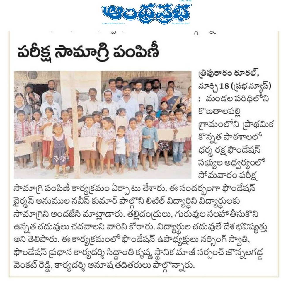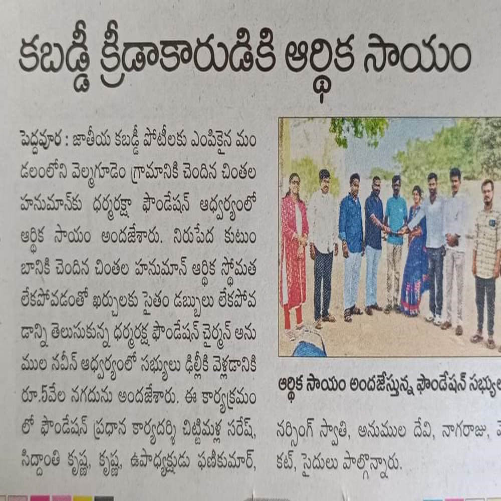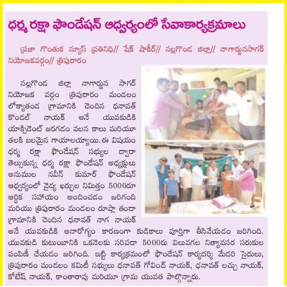 Dharma Raksha Foundation President, Anumula Naveen Kumar, emphasized that the foundation will always stand by the underprivileged. Recently, in Koppol village of Gurrampodu Mandal, the foundation provided financial assistance to the family of the late Gattupelli Yadagiri Reddy for family expenses after his passing due to illness. Additionally, they supported the family of Paloju Anjayya Chari, who is suffering from paralysis, with ₹5,000 for medical expenses. The event was attended by the foundation's Honorary Advisor Kommu Ramadasu, Secretary Nenavath Shankar Naik, Treasurer Ayitharaju Nagaraju, Tripuraram Mandal President Dhanavath Govind Naik, General Secretary Dhanavath Lachu Naik, along with local youth members Telukuntla Ravi, Venkatachari, Ramakrishna, Naresh, Shankar Goud, Ramakrishna, and Naveen.
